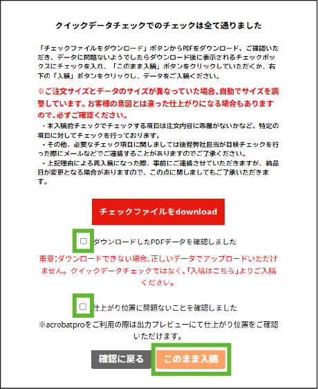 入稿してから翌日に不備が分かり、修正して再入稿・・・なんてこともありますが、クイックデータチェックならその場で、2分ほどでデータチェックの結果が分かります。