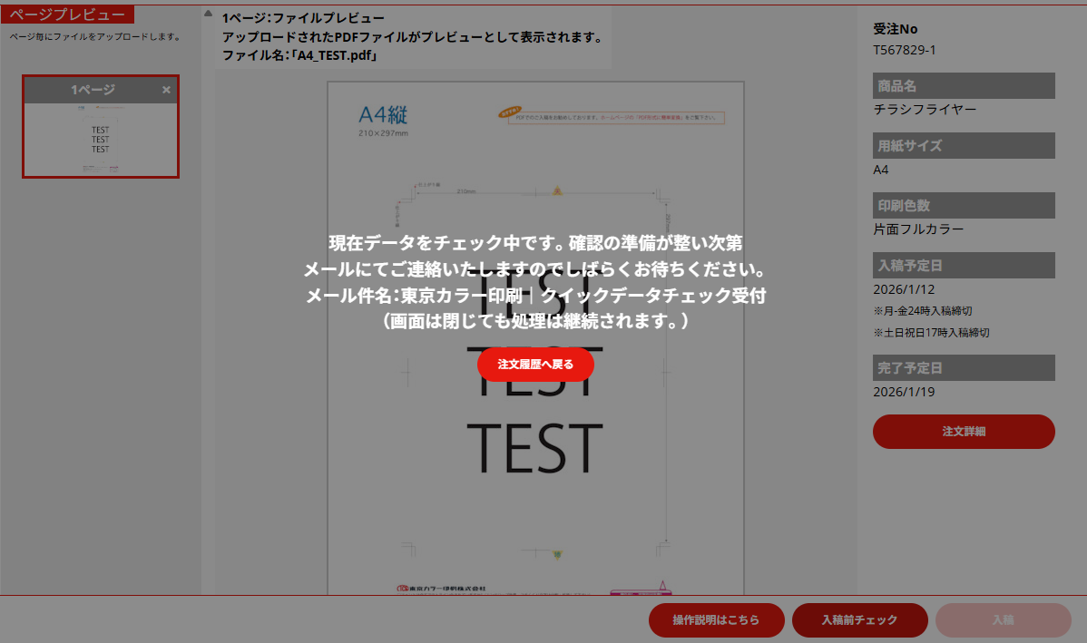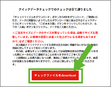 マイページ>注文履歴/データアップロードの画面に入り「クイックデータチェックはこちら」をクリック