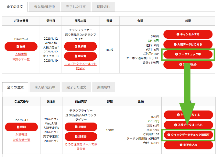 注文履歴の「データチェック中」が「クイックデータチェック確認可」になりましたら、